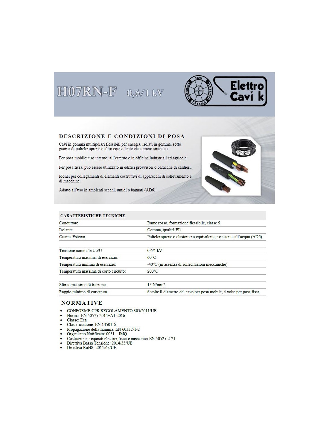 Tensione nominale Uo/U: 450/750 V c.a. - per posa fissa e protetta 0,6/1 kV c.a.