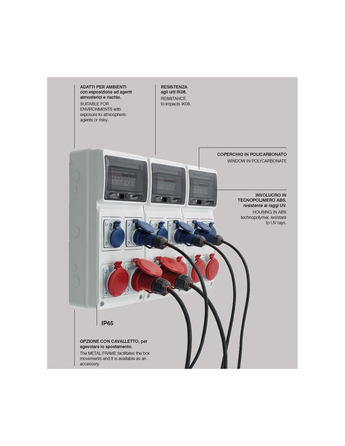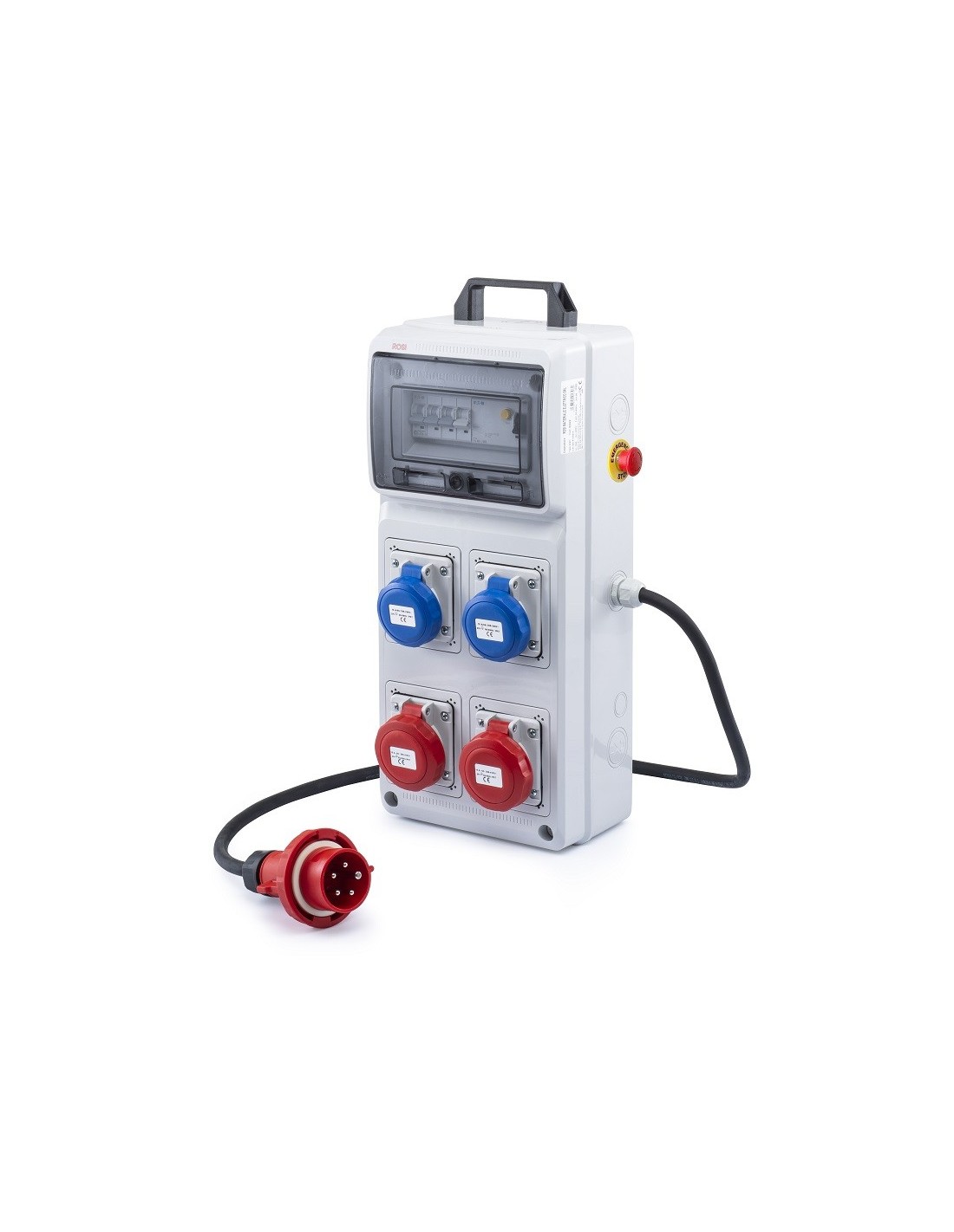 - Ingresso: 2 Prese Ind. 2P+T 16A IP67 (3 Poli) + 2 Prese Ind. 3P+T 16A IP67 (4 Poli) Uscita: 1 Spina Ind. 3P+N+T 16A IP67 (5 Poli)